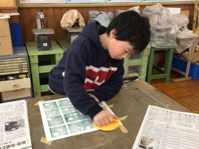 ひまわり学級では、図画工作で版画を制作しています。同じ版で色を変えて写す出すことで違った模様になることを楽しむ版画になっています。今日は青色で刷っていますが、色があまりはっきりしないことがわかったので、次は黒色で刷って色の重なり具合がよくなるようにしていきます。