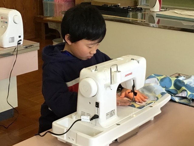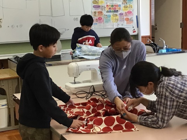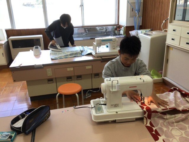 かていkの授業で学校へ贈る「のれん」を制作しています。トイレ用ののれんです。いよいよ完成です。最後のミシンぬいや仕上げのアイロンをしています。きれいに出来上がっています。