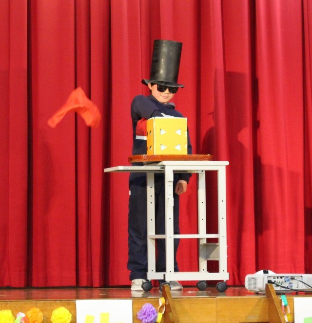 次に6年生の出し物です。3人の児童、それぞれが手品を披露しました。練習の成果が発揮でき、どの手品も見事で大きな拍手が沸き起こりました。