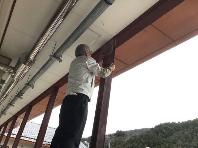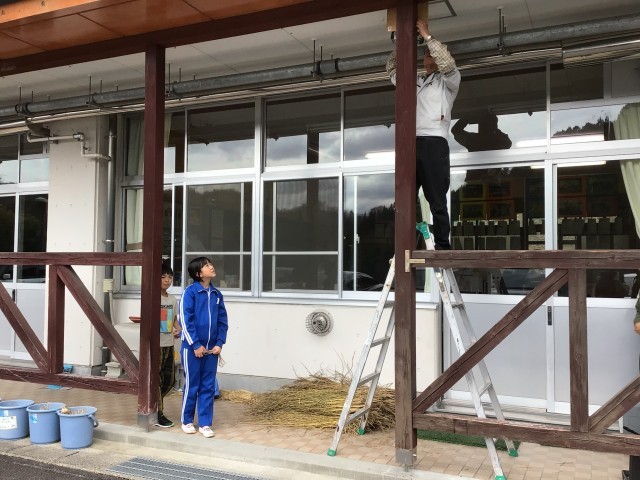 総合の時間に作ったツバメの巣の模型を教室前のテラスに設置しました。設置は公務手さんに協力していただきました。来年、ツバメが使ってくれることを祈っていました。