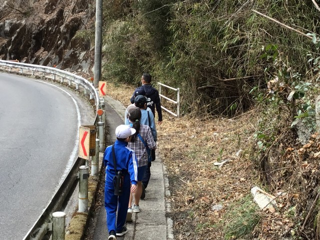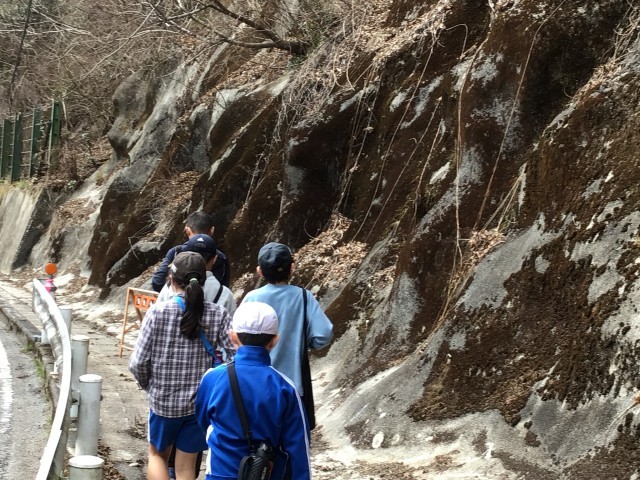 今日は、午後から月原にある防空壕の見学へ行きました。4キロほどの道のりを歩いて向かいました。子どもたちが住んでいる度合の地区より西側の方へは、これまでに歩いて行くことがほとんどなかったようで、道中にはいろいろな発見がありました。