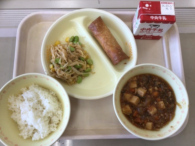 今日の給食は、麻婆豆腐、切り干し大根のさっぱりサラダ、愛知の野菜入り春巻き、ご飯、牛乳です。麻婆豆腐は「たべまる給食」で検索し、「Cookpad」をクリックすると作り方が出てきます。「愛知の野菜入り春巻き」は、ニンジン、キャベツ、レンコンの野菜が入っています。