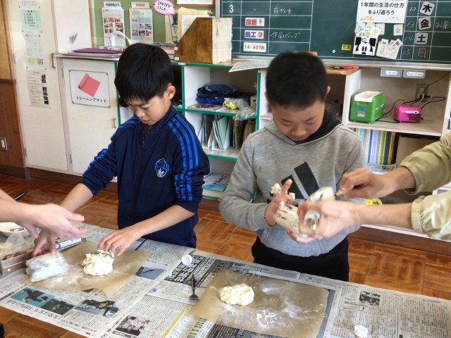 発酵した生地をペットボトルから出そうとすると発酵したガスの影響で、ペットボトルのふたを開けた瞬間、プシュッと音を立てて生地が出てきました。出てきた生地はとても柔らかく、子どもたちも驚いていました。