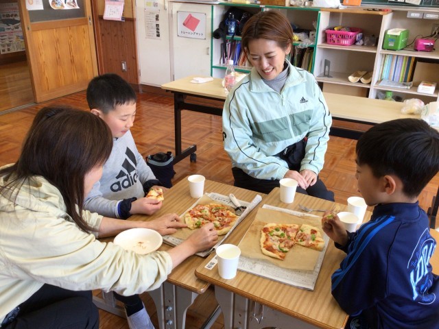 出てきた生地を丸め、外側に丸くなるように伸ばしました。ほどよく伸ばした後は、トマトソース(学校で栽培したトマトを以前に収穫して凍らせていたものを使いました)をぬり、ソーセージやベーコン、玉ねぎ、ピーマンなどをのせ、最後にたくさんチーズをかけました。