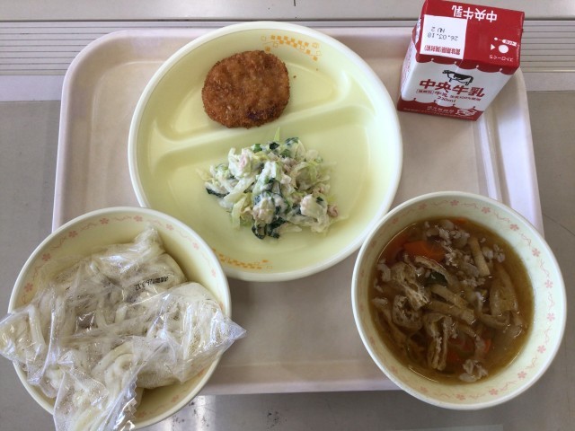 今日の給食は、肉うどん(白玉うどん)、レンコンサンドフライ、ツナサラダ、牛乳です。今日は、玉ねぎ、レンコン、しいたけ、キャベツ、ちんげんさい、大根、にんじん、ごぼう、ネギと9種類の野菜が入っています。