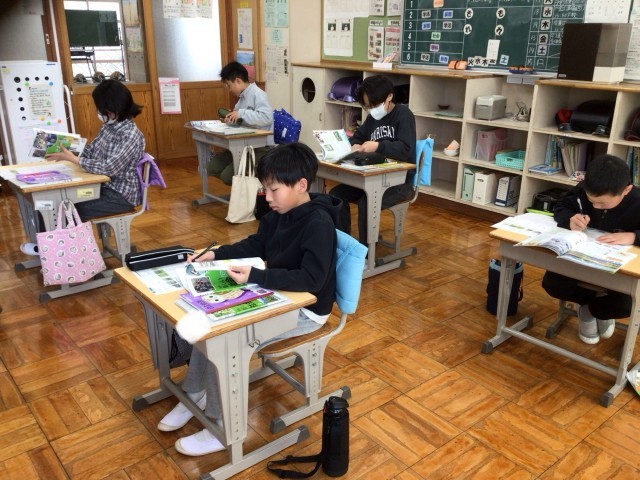 4年生は、遊具を取り入れてサーキットトレーニングのような運動に取り組んでいました。この後、テニピンのゲームも行っていました。5・6年生は、社会でワークシートを使って分からないところを調べながら確認をしていました。こうやって、いまのメンバーで学習できるのもあと少しになりました。