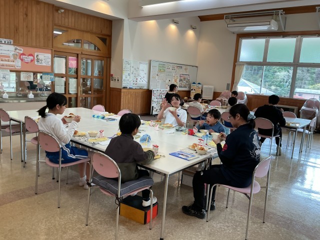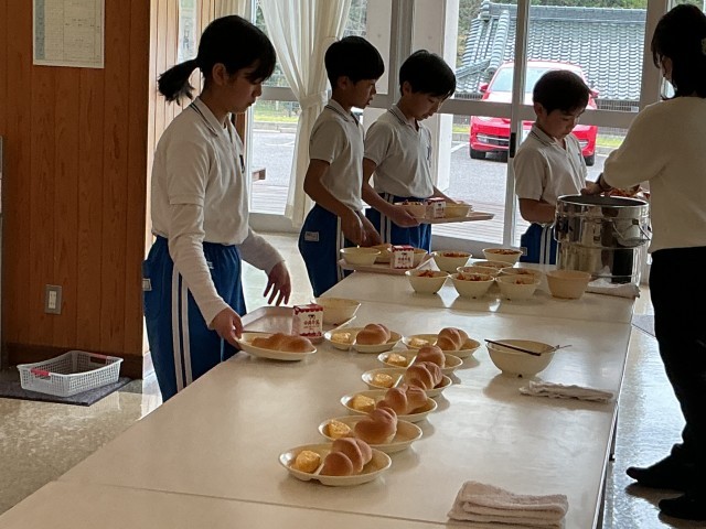今日の給食は、ペンネのトマト煮、オムレツ、コールスローサラダ、ツイストパン、牛乳です。今日のメニューには、キャベツ、にんじん、きゅうり、スイートコーン、玉ねぎ、トマト、ピーマン、しめじと、8種類の野菜が入って栄養がいっぱいです。今日は1年生にとって、初めてのパン給食です。