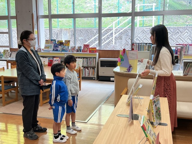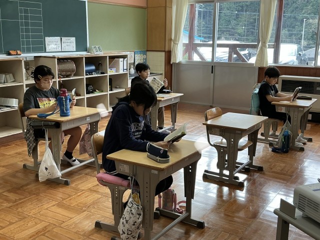 今朝のさわやかタイム。5•6年生は、読書に集中しています。あさがお学級は、校歌の練習をしています。1年生は、司書さんに図書コーナーの使い方について教えていただいています。