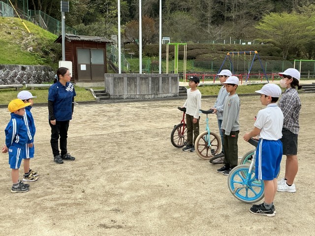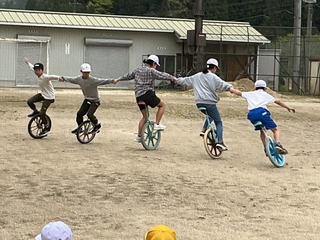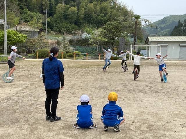 さわやかタイムを使って、全校で運動会に向けて一輪車の練習を始めました。今日は最初ということもあり、1年生に5•6年生が見本を見せました。5•6年生も一輪車に乗って演技をすることは久しぶりで大丈夫か心配でしたが、体がしっかりと覚えており、上手に演技を行うことができました。さすがです。