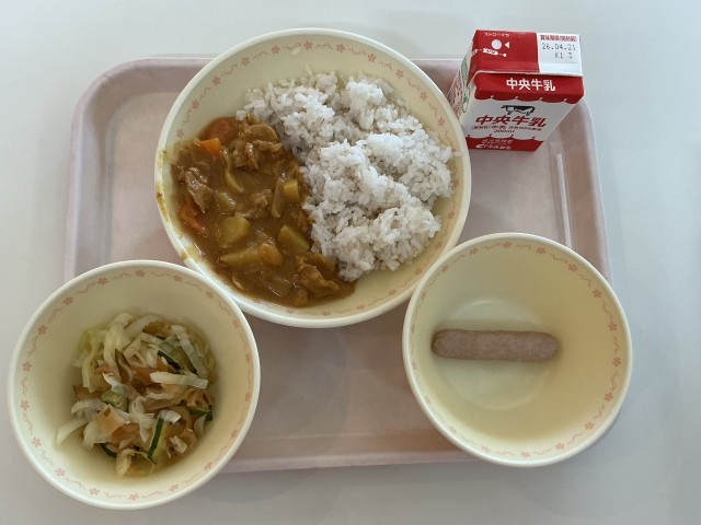 今日の給食は、カレーライス、ウインナー、福神サラダ、麦ご飯、牛乳です。カレーライスは、みんな大好きなのでたくさん食べます。福神サラダは、福神漬けだけでなくキャベツやきゅうりが入っていて、歯ごたえがあり食べやすくなっています。今日はみんな早く食べ終わって、読書の時間を楽しんでいます。