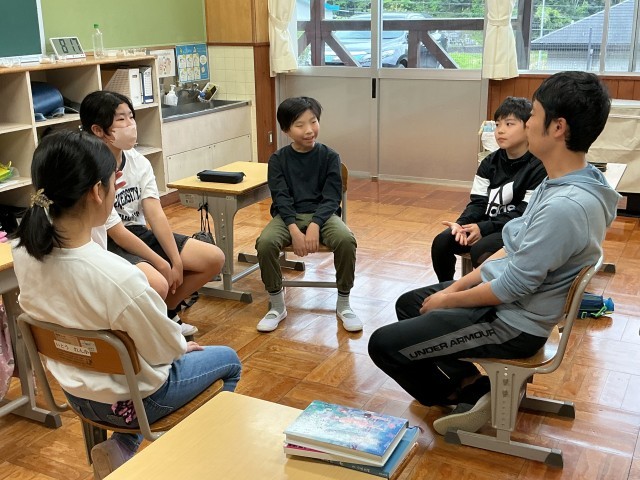 今朝のさわやかタイムは対話タイムです。5•6年生は、今の気分は何%?、あさがお学級は、うどんとそばとどちらが好き?、1年生は、給食で好きなメニューについて対話をしました。顔を向き合って話をすると相手の表情も感じることができて、相手の様子を考えながら話をすることができます。
