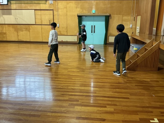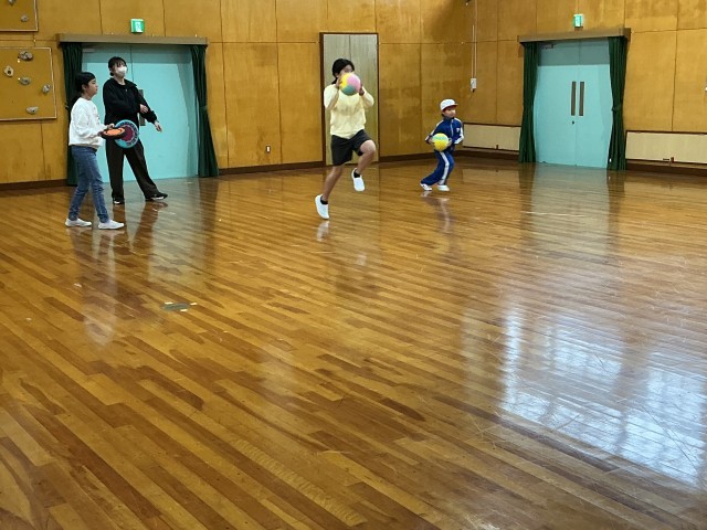 雨の日は、集会室で遊んでいます。今日は、ドッジボールをしています。これまでとは違い、1年生もいっしょにドッジボールをするので1年生が困らないように考えながら遊んでいます。