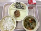 今日の給食は、ハンバーグのおろしソースがけ、白味噌汁、ひじきサラダ、ごはん、牛...