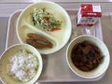 今日の給食は、チャプチェ、肉だんごのスープ、ヤンニョムチキン、ごはん、牛乳です...