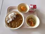 今日の献立は、麦ごはん、牛乳、カレーライス、カラフルソテー、みかんです。今日は...