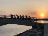 6年生が夕日をバックに記念写真です。