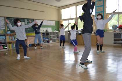 全校で取り組んだダンス(Shinig road)ではコロナウイルス対策のために各教室で縦割り班ごとに活動しました。