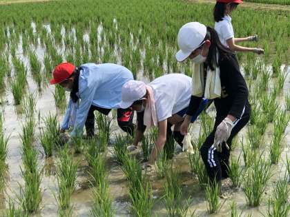 振り返りの際には、手作業による草取りのよさに改めて気付き、自分たちの活動に自信をもつことができたようです。今後は、今日知ったことを生かしてバケツ稲の世話を行い、水抜き(中干し)に取り組むことで、より一層ミネアサヒへの愛を深めていきます。