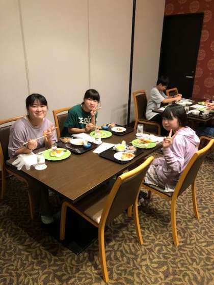 楽しみにしていたホテルでのランチバイキングです。前菜からお肉やオムレツやピザなど、自分の好きな料理をお皿に取って、安全な個室でいただきました。中には何度も料理を取りに行く子もいて、みんなおなかいっぱいになりました。最後にデザートも食べて、大満足のランチタイムとなりました。この後は、いよいよ最後の見学地、法隆寺へ出かけます。