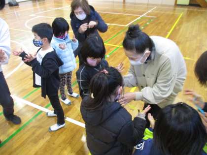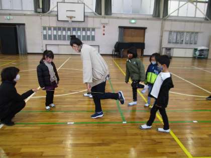 地域の「遊び名人」のお二人から1年生が昔遊びを教えてもらいました。ゴム跳びやあやとりなど、いろいろな遊びを教えていただき、楽しく遊びました。