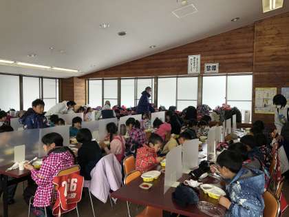 お楽しみのお昼ごはんです。メニューはカレーです。みんな黙食で静かに食べています。早速おかわりをする子たちもいました。この後、集合写真を撮って午後の練習が始まります。小雪が降っていて少し寒いですが、子ども達は元気いっぱいです。
