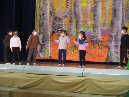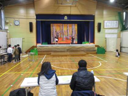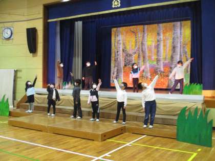 今日は、劇団うりんこさんによる全校演劇指導がありました。まずは、1・2年生からです。覚えたてのセリフを一生懸命に言いながら、動きの確認をしていました。劇団の方からは、声の出し方や表現の仕方などを丁寧に教えていただきました。