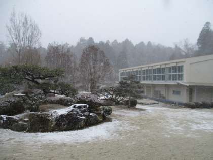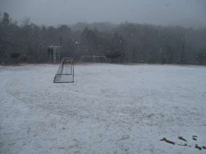 今日は朝から気温が低く、子どもたちが登校する時間から雪が降ってきました。現在も雪が降り続いており、学校がスキー場のような景色になっています。