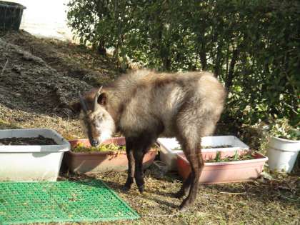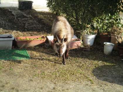 朝学校に来ると、児童玄関横の畑の前に足をけがしたニホンカモシカが立っていました。子どもたちを来客用の玄関から校舎内に入れるなど、安全対策を講じながら市役所の方が到着するのを待ちました。しばらくすると、ニホンカモシカは自力で歩いて桜坂の方へ移動を始め、市役所の方が近くに行くと、やがて谷を降りて山の中に戻っていきました。今は全く姿が見えません。市役所の方から「もう大丈夫です」というOKをいただきました。子どもたちにけがや危険なことはありませんでした。