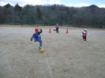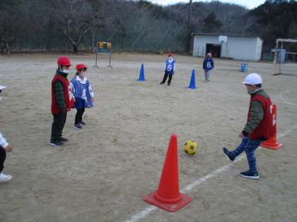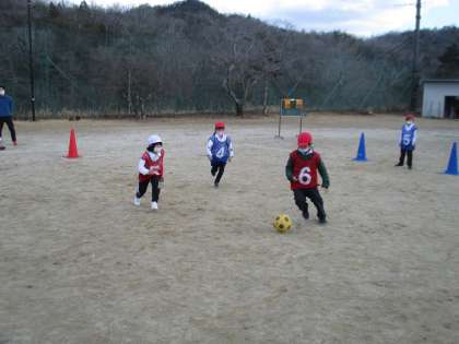 1・2年生の体育の授業の様子です。ゴールが4つあるサッカーの試合をしていました。初めは、自分が好きなようにボールを蹴っているだけでしたが、慣れてくると味方にパスするようになり、チームプレーができるようになってきました。