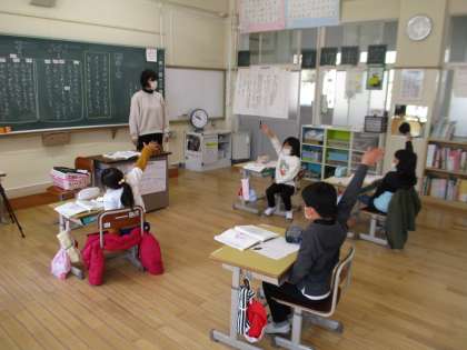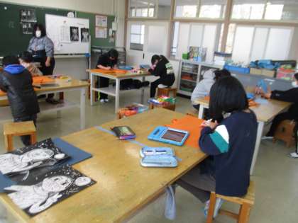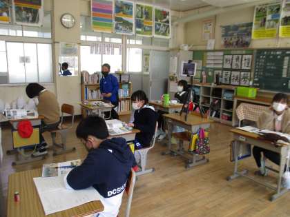 1年生は国語「スイミー」の授業で、物語に出てくる魚たちの気持ちについて話し合っていました。4年生は図工の授業で、作品を入れるバッグにオリジナルの絵を描いていました。5年生は社会科の授業で、自然災害の防ぎ方について意見を出し合っていました。