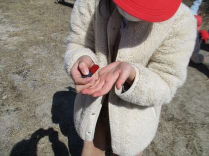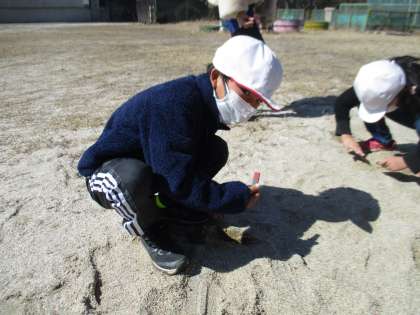 3年生は理科の授業で「運動場で砂鉄を見つけよう」という授業をしていました。子どもたちは、砂鉄がありそうな場所を見つけて、棒磁石を使って砂鉄を探していました。御作小学校の運動場には、あまり砂鉄がないようです。