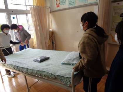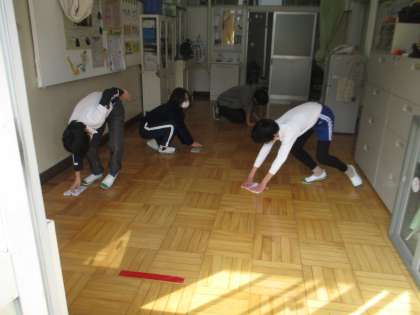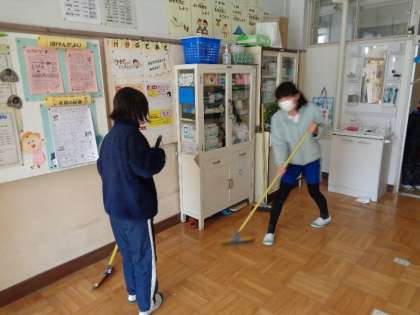 大掃除の様子です。保健室の床をワックスがけするために、6年生が率先して手伝ってくれました。6年生のおかげで、荷物の運び出しや床掃除がとても早くできました。6年生のみなさん、ありがとうございました。