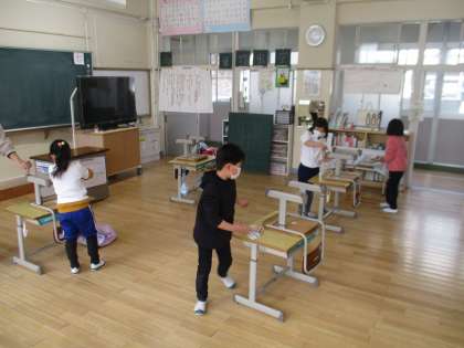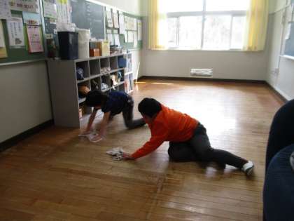 自分たちの教室をきれいにするために、全校児童が一生懸命掃除をしました。下校後は、先生たちでワックスがけを行いました。ピカピカになった教室は気分がいいですね。
