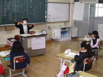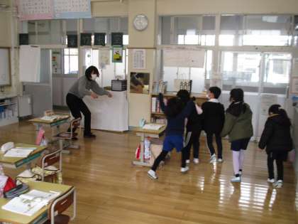 1年生の国語「スイミー」の授業の様子です。話し合いの中で、「見えない糸で引っ張られる魚みたい」という意見が出されたので、実際にどんな動きになるのか、先生が見えない糸を引っ張り、子どもたちが魚になりきって確かめていました。みんな、本当の糸に引っ張られているような魚の動きができていました。学芸会での演技練習が生かされていますね。