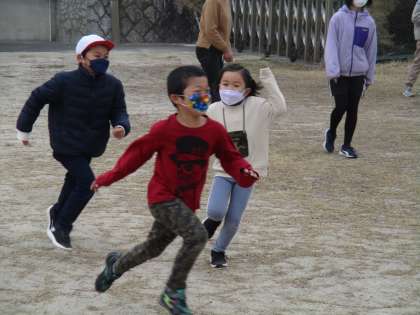 1・2年生と6年生が、放課に「色おに」で遊んでいました。おに役の子が「黄色」などと色を指定すると、みなが一斉に逃げて黄色いものを探してタッチします。指定の色をタッチする前におに役にタッチされるとつかまってしまいます。この遊びを通して、1.2年生と6年生がますます仲良くなりました。