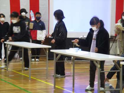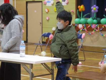 5年生企画「縦割り班遊びファイナル」の様子です。初めは「ペットボトルフリップ」です。水が入ったペットボトルを投げて、見事立ったら成功です。簡単そうに見えますが、実際はなかなか難しいようです。6年生も頑張りましたが、1番初めに成功したのは2年生でした。みんな楽しそうでした。