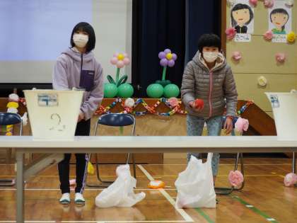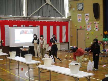 最後の企画は「バケツにポン!」です。机の上に置いたバケツに、離れた所から球を投げて、いくつ入るかで競うというものです。意外と難しそうで、バケツに球が入ったのは2人だけでした。総合結果は、1位が3チーム(1つは先生チーム)で並びました。今年1年間、6年生が中心となって様々な縦割り班遊びを企画してきましたが、最後は5年生が企画を考え、とても楽しい時間を演出してくれました。5年生のみなさん、ありがとうございました。