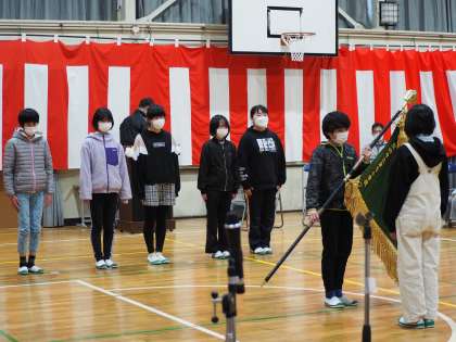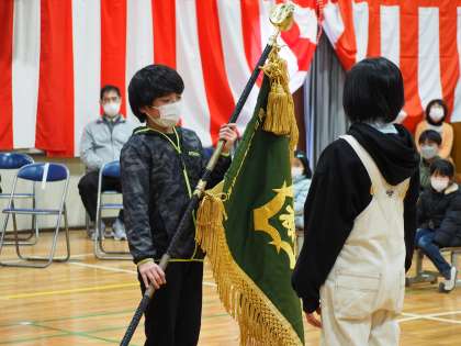 6年生から5年生へ校旗の受け渡しがありました。6年生代表から「これからの御作小学校を5年生へ託します」という言葉と共に、5年生代表へ校旗が手渡されました。5年生の表情からは、6年生が作ってくれた御作小学校の伝統をしっかり受け継いでいこうという意気込みが伝わってきました。