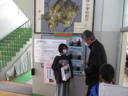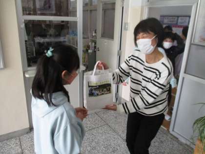 5年生が、総合的な学習の時間の取組で、自分たちが育てたお米「ミネアサヒ」のことを広く知ってもらおうと、収穫したミネアサヒを全校の子どもたちに配付しました。ぜひ、ご家庭で子どもたちと一緒に食べていただき、「幻の米」と言われている地元産のミネアサヒのことを知っていただきたいと思います。また、5年生の子どもたちから「東日本大震災で被災した方たちへ何か支援したい」という話があり、ミネアサヒを先生方に販売して得たお金を募金という形で送ることにしました。1年間を通して学んだことを、いろいろな人に知ってもらう良い機会となりました。