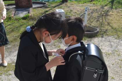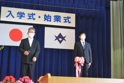 6年生が受付の係を担当して、新1年生に花をつけてくれました。さすが6年生、とてもよい動きでした。また、入学式の前に、新しくみえた2人の先生方の自己紹介がありました。