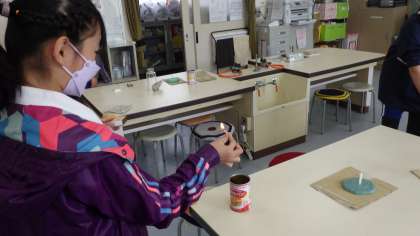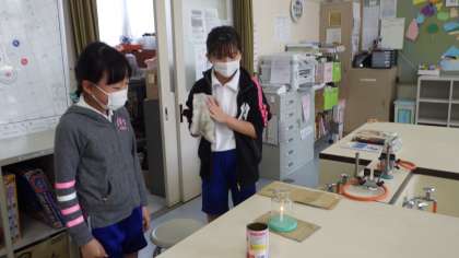 6年生の理科の授業の様子です。マッチを使ってろうそくに火をつけ、容器をかぶせると火がどうなるかを確かめていました。結果はどうなったでしょうか?