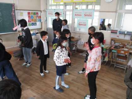 Eタイム(イングリッシュタイム)の時間に、2・3・6年生が交流学習を行いました。お互いに英語であいさつしたり、ジャンケンをしたりしながら交流を深めました。