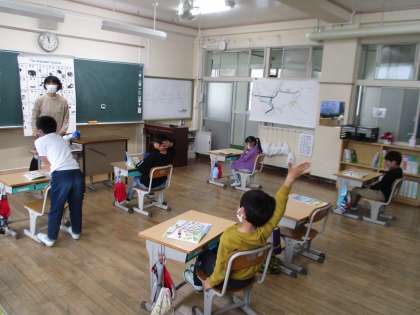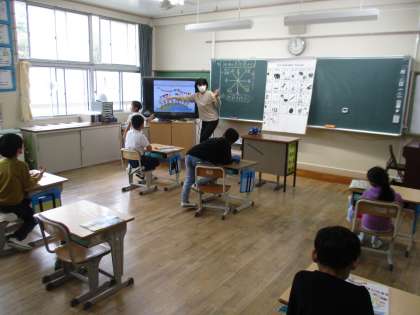 3年生の外国語活動の様子です。国旗を見ながら国の名前を英語で答えていました。