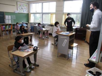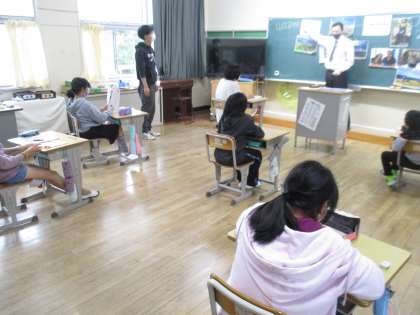 5年生の英語の授業の様子です。6年生と同じくALTの先生の自己紹介を英語で行いました。確認テストもあり、ALTの先生のことがよく分かりました。