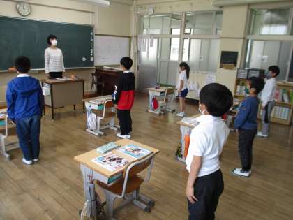 3年生の授業開始のあいさつの様子です。日直の号令に合わせて、みんなとても良い姿勢できびきびとあいさつしていました。