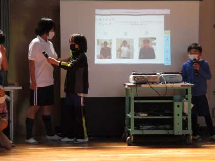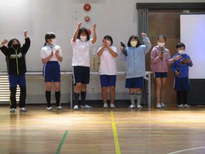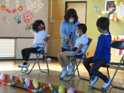 5時間目に「1年生を迎える会」を行いました。6年生の司会進行で会が始まり、最初に5年生企画のクイズがありました。1年生が教室当てクイズや先生の名前クイズに挑戦し、見事全問正解でした。