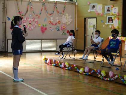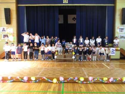 会の最後に児童会長から1年生に話をして、記念の全校写真を撮りました。全校で楽しい時間を過ごしたので、みんなとてもいい笑顔でした。1年生のみなさん、今日は楽しかったですか。これからもみんなで仲よく過ごしましょう。