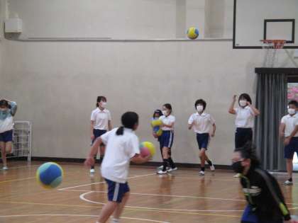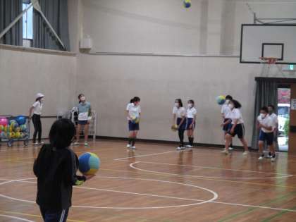 5・6年生の体育の授業の様子です。ペアでボールを使った運動をしていました。