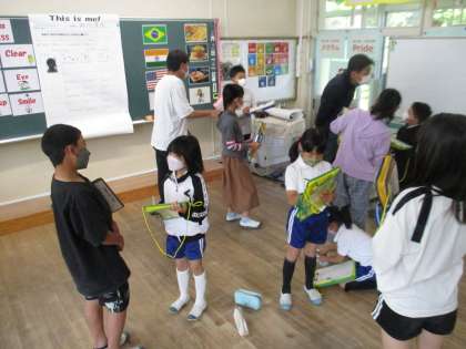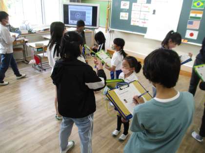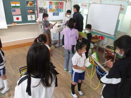 2年生と6年生のEタイムの様子です。6年生が優しく2年生に接してくれるので、2年生はとても楽しく取り組むことができ、自然に英語を使う姿が見られました。