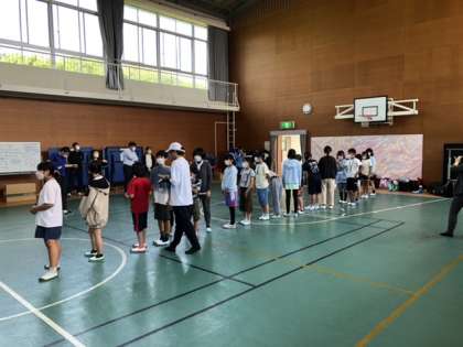 佐久島しおさい学校に着きました。初めに、声を出さないで誕生日順に並ぶというゲームをしました。その後、お互いの学校の紹介などをしました。